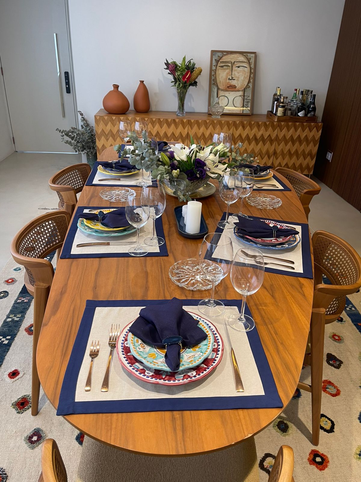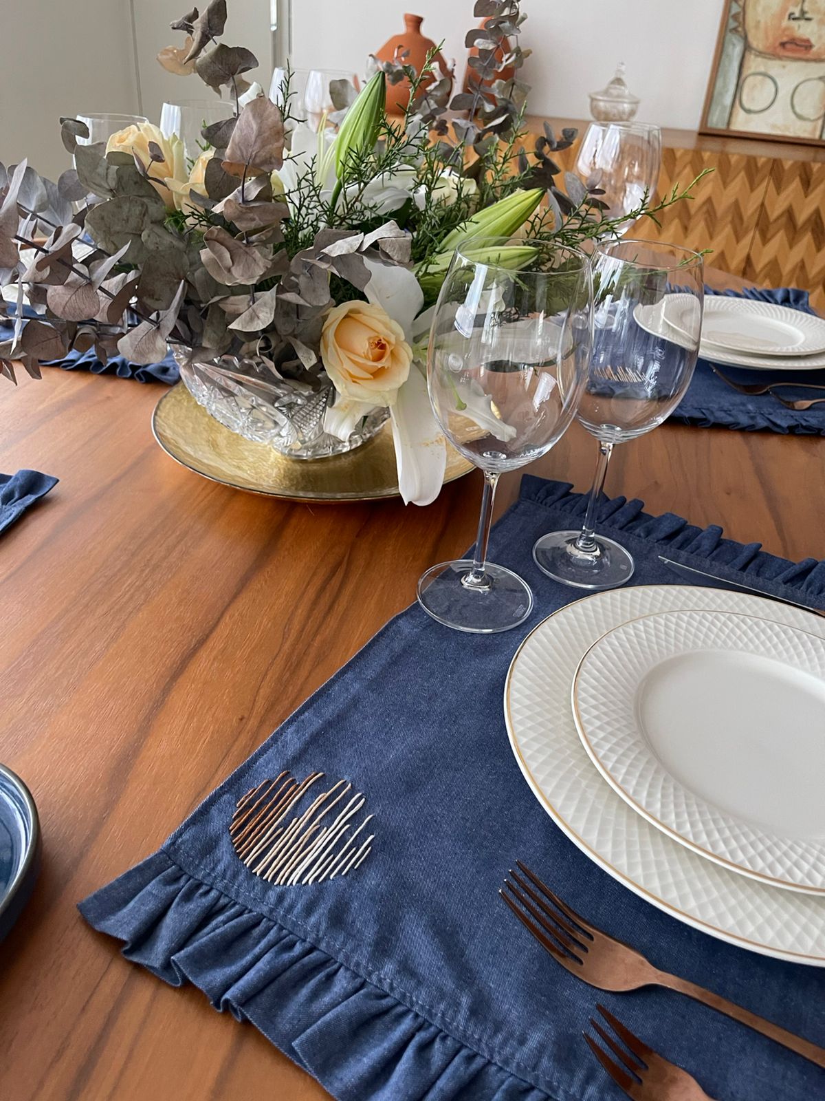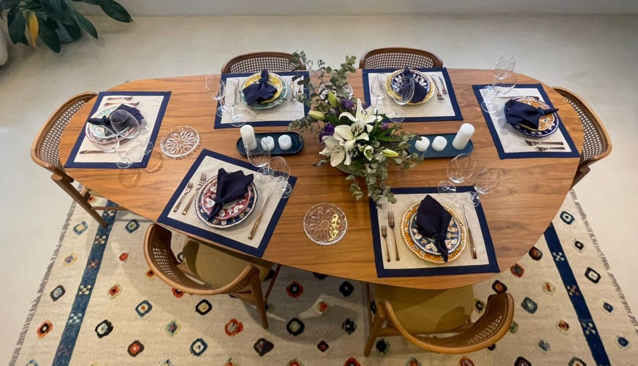 A coleção Azul Imperial nasce para quem entende que a verdadeira elegância está nos detalhes. Inspirada na sofisticação clássica das mesas que marcam momentos especiais, cada peça é confeccionada em 100% algodão, com toque macio, caimento impecável e acabamento que valoriza a beleza do tecido. Alguns itens recebem bordados feitos à mão, um trabalho delicado que transforma cada peça em algo único — quase como uma joia para a mesa. O azul profundo, símbolo de nobreza e serenidade, cria composições refinadas e atemporais, perfeitas para quem acredita que receber bem é uma forma de arte e que a casa deve refletir cuidado, estilo e personalidade.